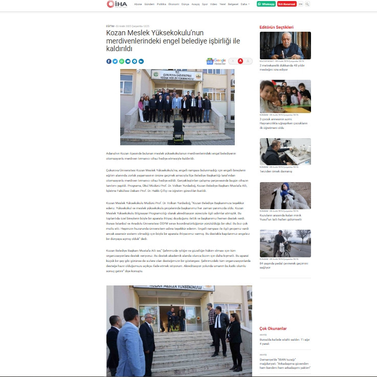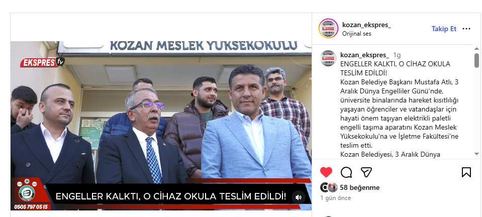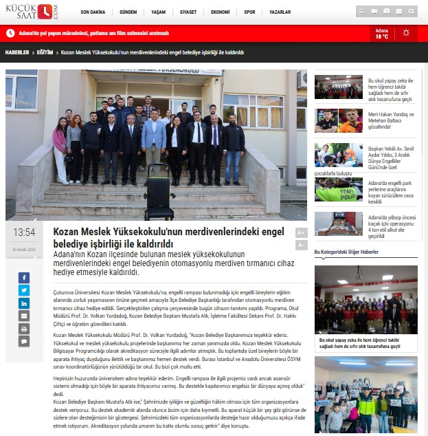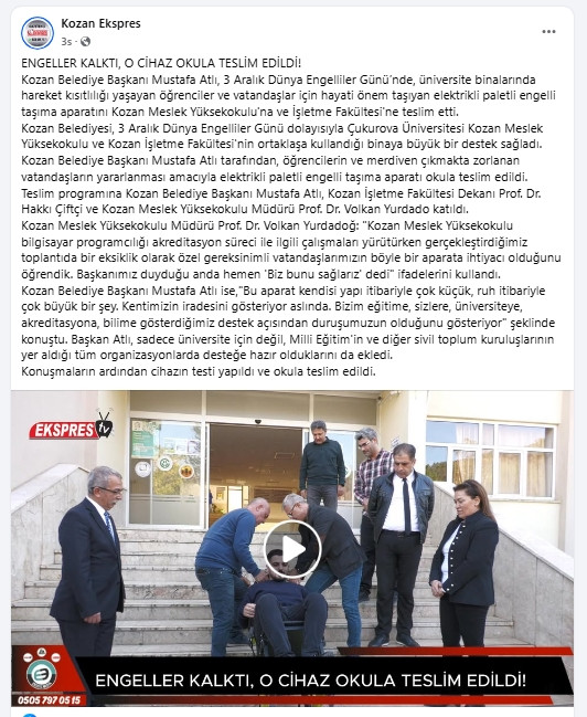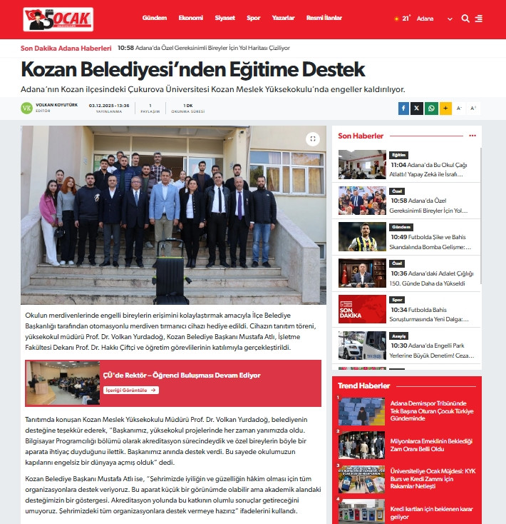 Kozan Meslek Yüksekokulu ve Kozan işletme Fakültesi eğitimlerinin yanı sıra, ÖSYM Başkanlığı, Anadolu ve İstanbul Üniversitelerinin sınav koordinatörlüklerinin de yürütüldüğü Meslek Yüksekokulumuzda bu cihazın kazandırılmasıyla kapılarımızı özel gereksinimli öğrencilerimiz ve vatandaşlarımız için engelsiz bir dünyaya açmış olduk.