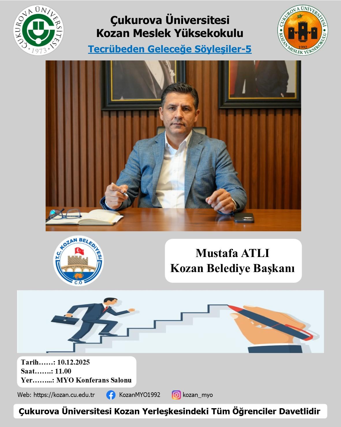 Tecrübeden Geleceğe Söyleşiler etkinliğimizin beşincisinde Kozan Belediye Başkanı Sayın Mustafa ATLI 10.12.2025 Çarşamba günü yüksekokulumuz konferans salonunda saat 11.00’de öğrencilerimiz ile bir araya gelecektir. Ç.Ü. Kozan Yerleşkesindeki tüm öğrencilerimiz davetlidir.