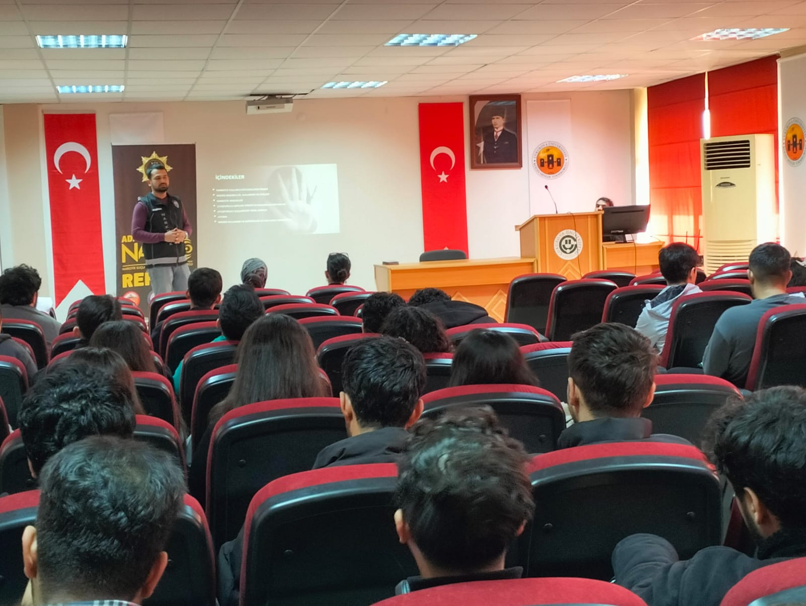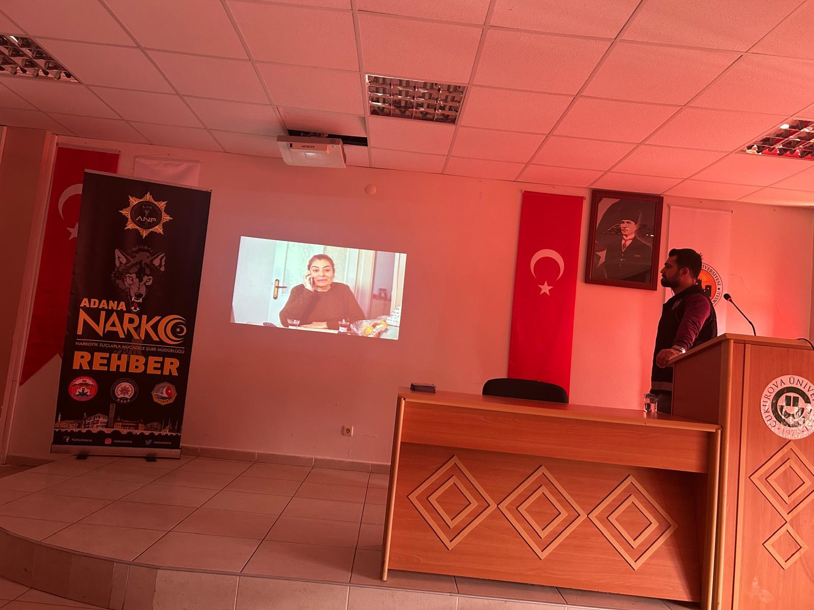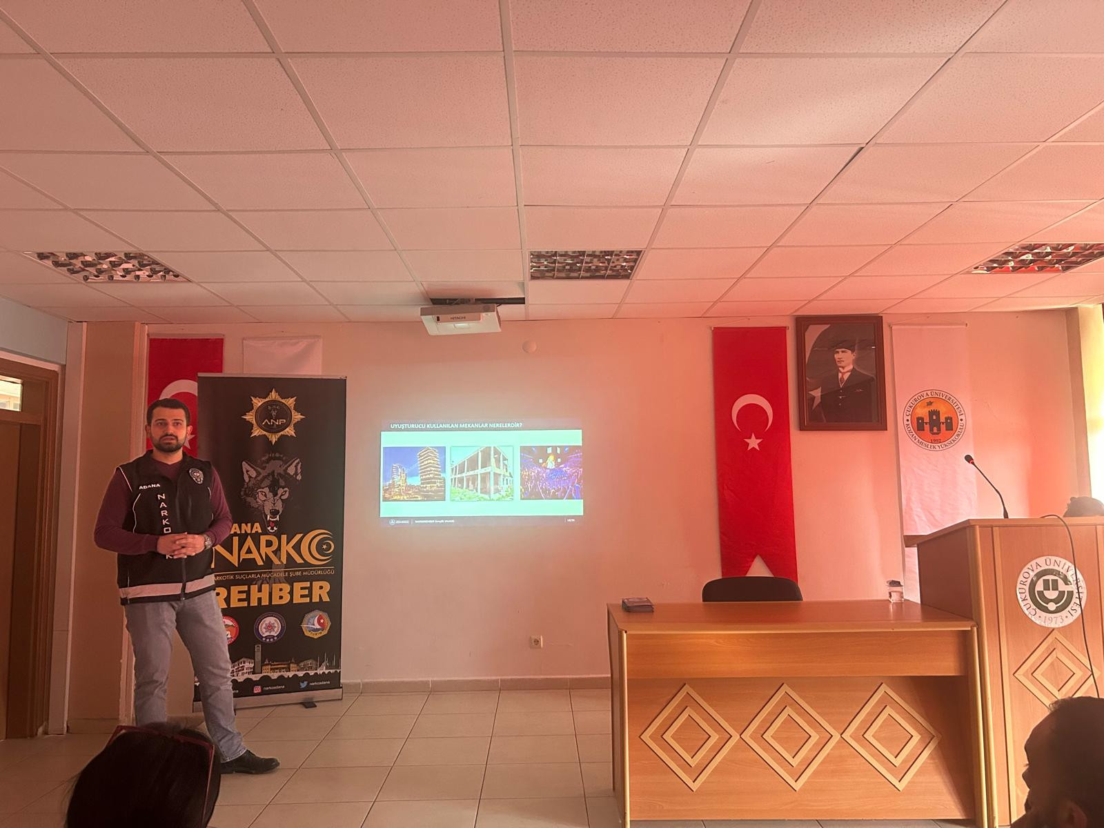 Yüksekokulumuzun düzenlemiş olduğu Farkındalık Seminerlerinin yirmi altıncısı Narko Rehber Eğitimleri “Bağımlılıkla Mücadele” semineri Kozan İlçe Emniyet Müdürlüğü Narkotik Suçlarla Mücadele Şubesi katkılarıyla 11 Aralık 2025 Perşembe günü saat 11.15'te Konferans Salonumuzda gerçekleştirildi.