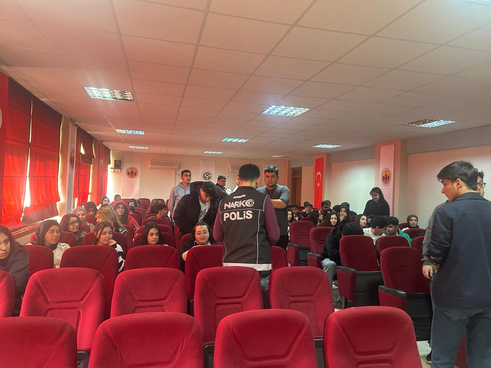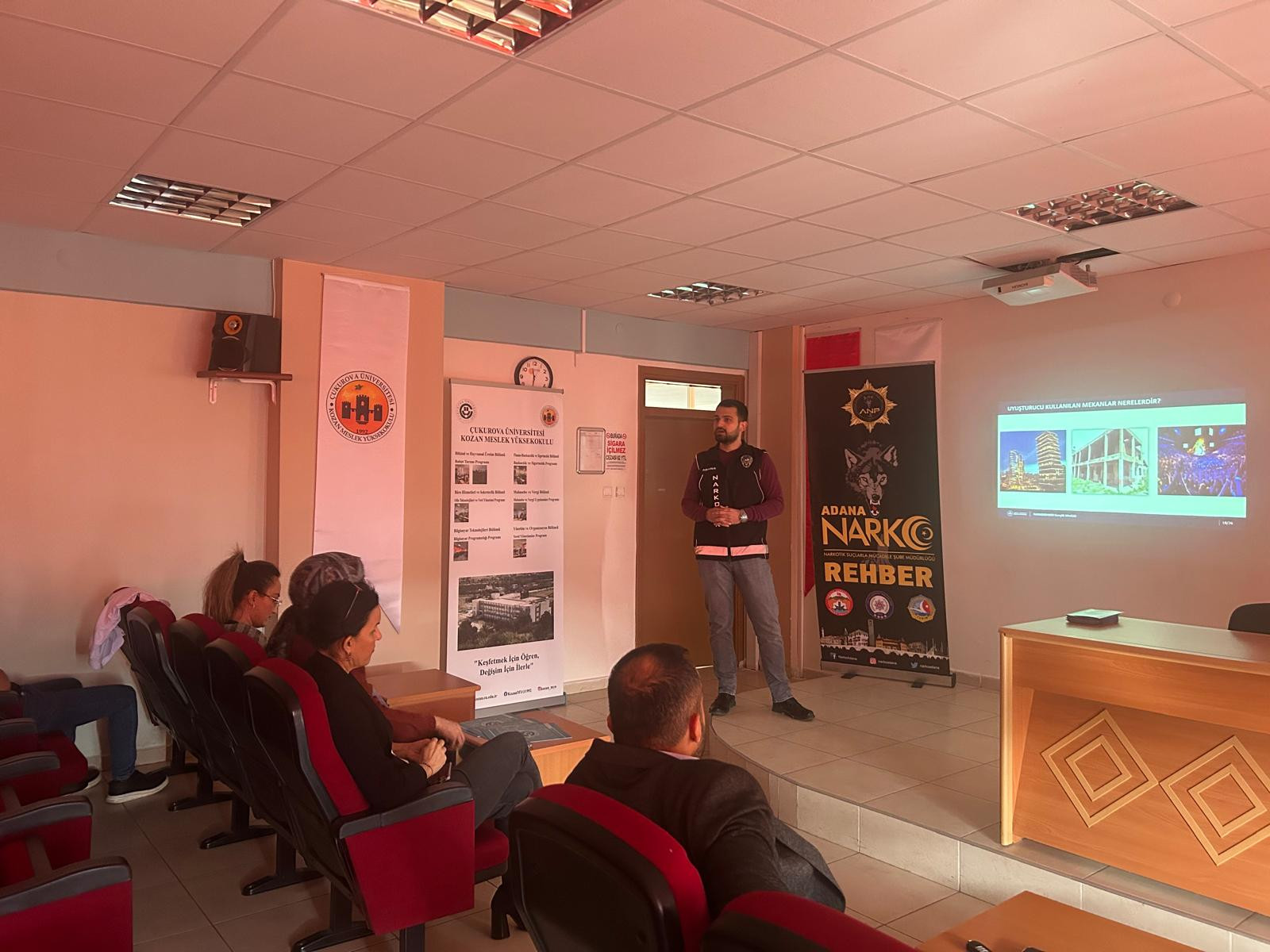 Kozan MYO Konferans Salonunda gerçekleşen seminerde öğrencilerimize “Bağımlı Olma, Özgür Ol” sloganıyla gerekli bilgilendirmeler yapıldı. Bu slogan kapsamında bağımlılık, madde bağımlılığı, belirtileri, bağımlılıkla nasıl mücadele edileceği ve mücadele merkezleri konusunda Narkotik Suçlarla Mücadele Şube Amirliğinde görevli polis memurları tarafından gerekli açıklamalar yapıldı.