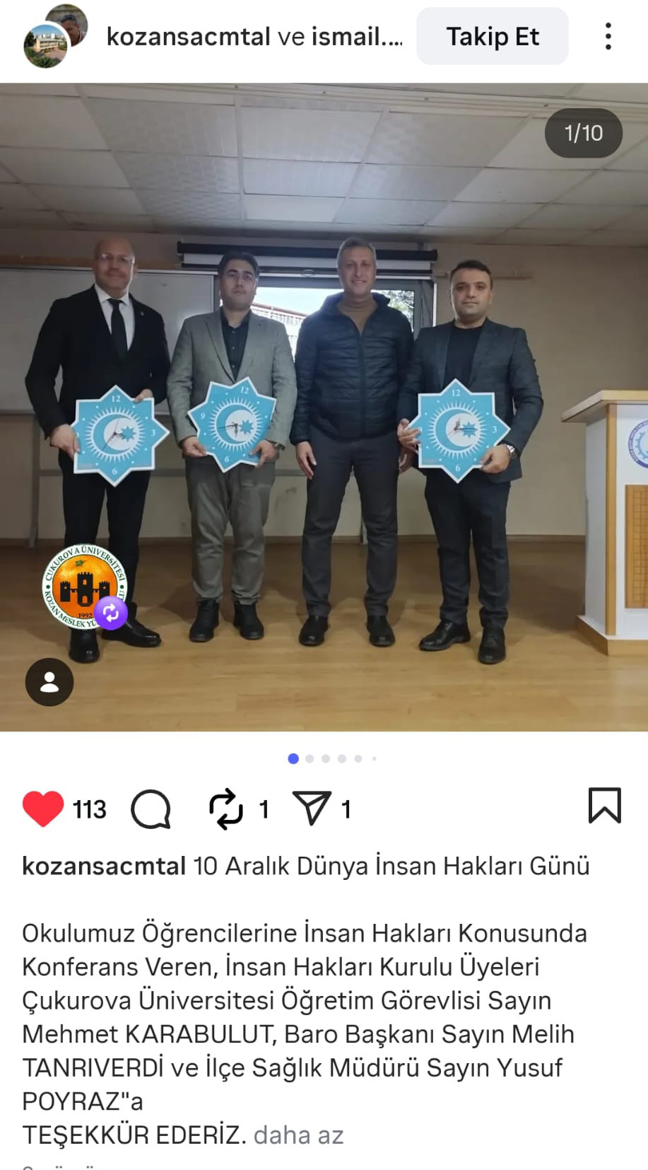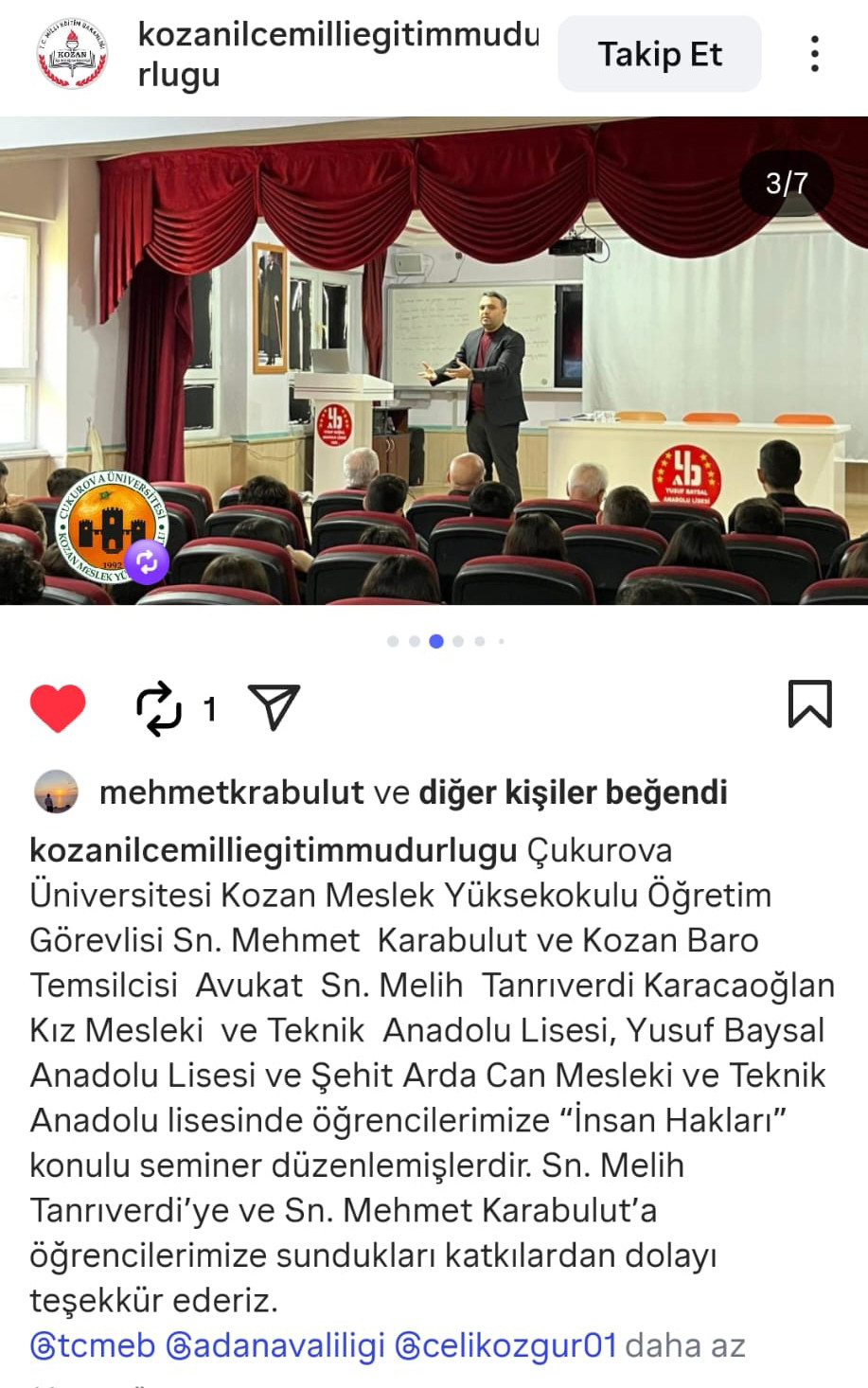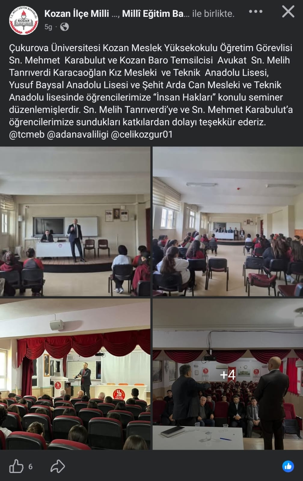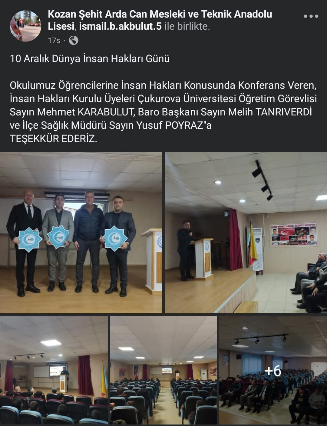 Kozan Meslek Yüksekokulu’nu temsilen Kozan İlçe İnsan Hakları Kurulu üyesi olarak görev yapan Öğr.Gör. Mehmet KARABULUT, 10 Aralık Dünya İnsan Hakları Günü dolayısıyla Kozan ilçesinde bulunan Şehit Arda Can Mesleki ve Teknik Anadolu Lisesi, Yusuf Baysal Anadolu Lisesi ile Karacaoğlan Kız Mesleki ve Teknik Anadolu Lisesi’nde insan hakları konulu seminerler gerçekleştirmiştir.