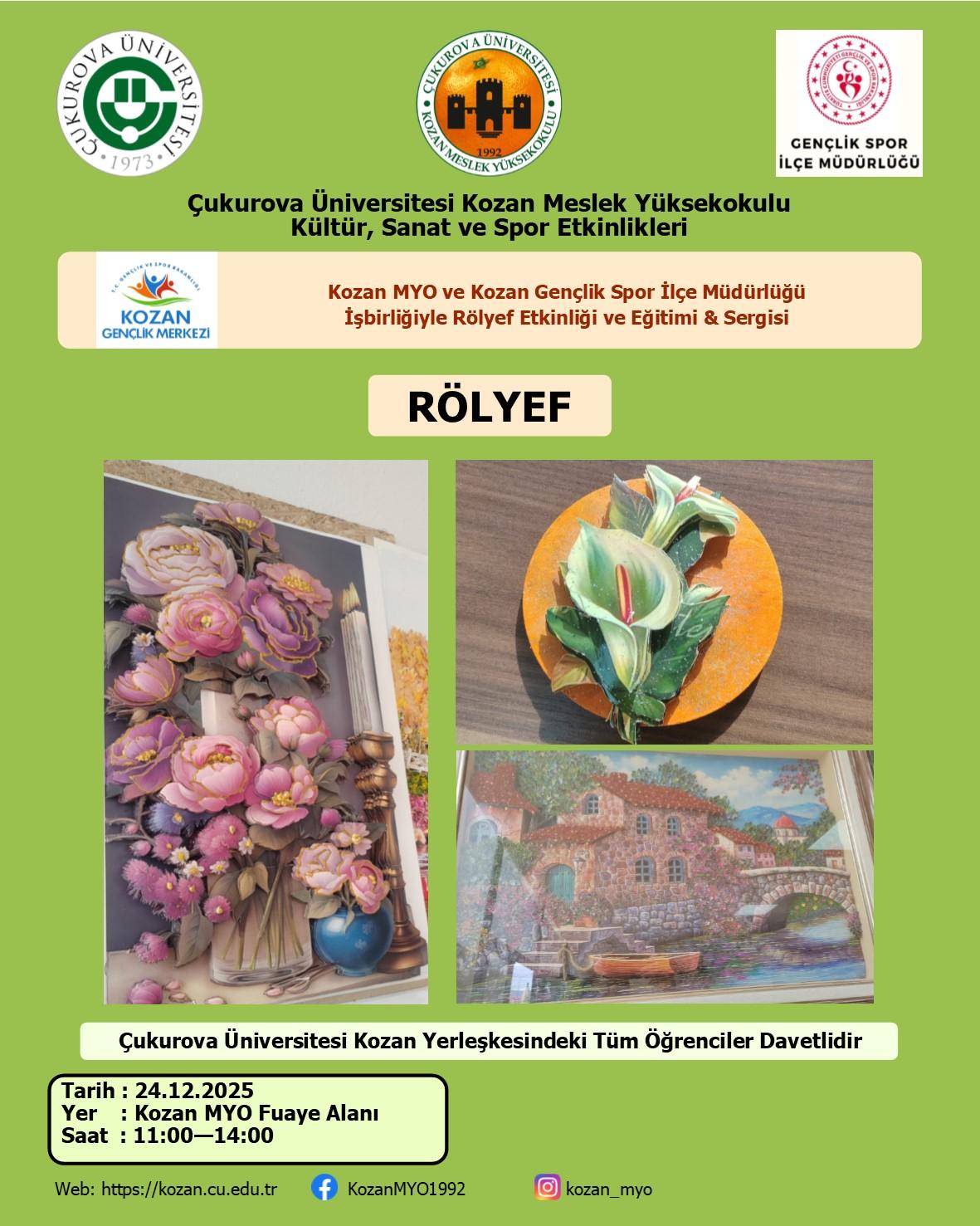 2025-2026 Eğitim Öğretim yılında Kozan Meslek Yüksekokulu ile Kozan Gençlik ve Spor İlçe Müdürlüğü işbirliğiyle yıl boyu çeşitli alanlarda yapılacak olan Kültür-Sanat-Spor etkinlikleri ve eğitimlerinden Rölyef Etkinliği ve Eğitimi & Sergisi 24 Aralık 2025 Çarşamba günü 11.00-14.00 saatleri arası Yüksekokulumuz Fuaye Alanında gerçekleştirilecektir. Kozan Yerleşkesindeki tüm öğrencilerimiz davetlidir.