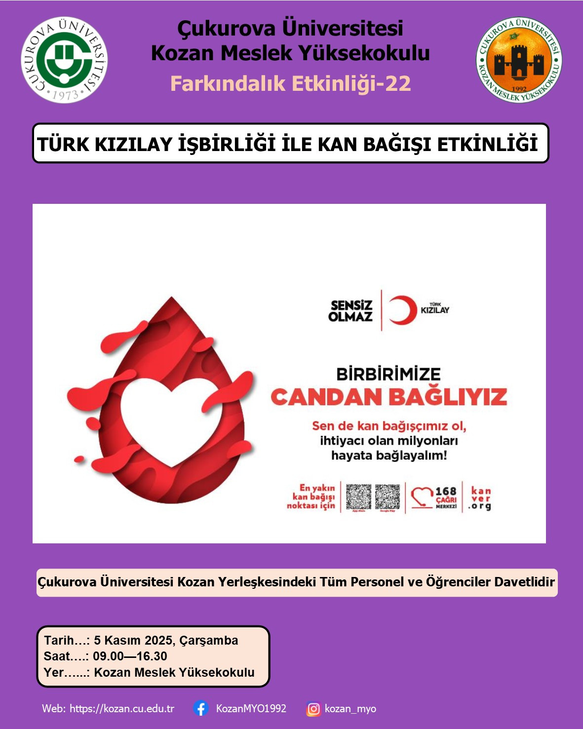 Kozan Meslek Yüksekokulu Farkındalık Etkinliklerinin yirmi ikincisinde Türk Kızılay işbirliği ile düzenlenen “Kan Bağışı Etkinliği” 5 Kasım2025 Çarşamba günü 09.00- 16.30 saatleri arasında Çukurova Üniversitesi Kozan Yerleşkesinde yapıldı.